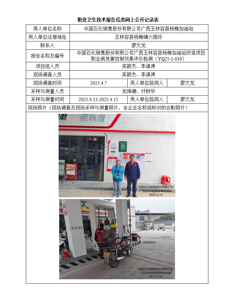 中國石化銷售股份有限公司廣西玉林容縣楊梅加油站改造項目職業(yè)病危害控制效果評價檢測