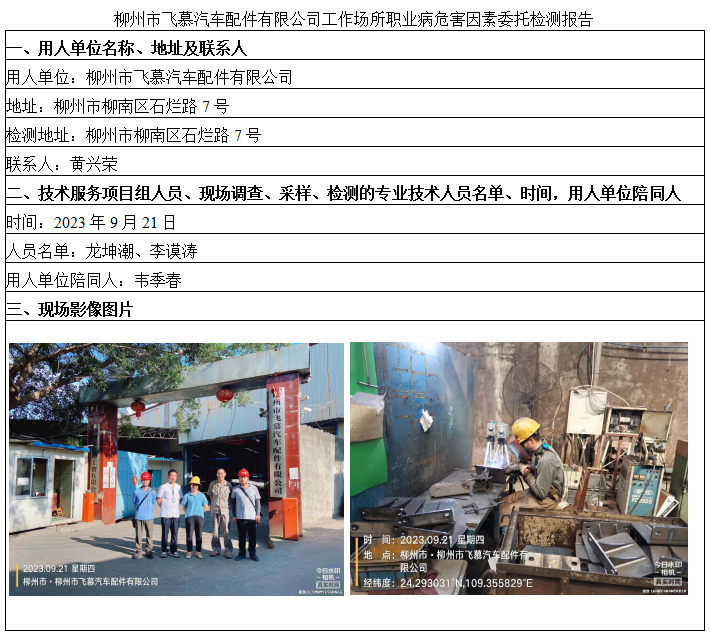 柳州市飛慕汽車(chē)配件有限公司工作場(chǎng)所職業(yè)病危害因素委托檢測(cè)報(bào)告