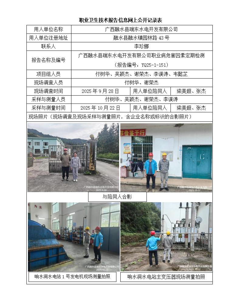 廣西融水縣瑞東水電開發(fā)有限公司職業(yè)病危害因素定期檢測(cè) (報(bào)告編號(hào):YQ25-1-151)