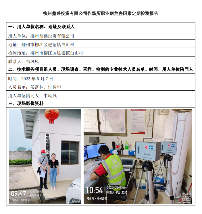 柳州鼎盛投資有限公司作場(chǎng)所職業(yè)病危害因素定期檢測(cè)報(bào)告