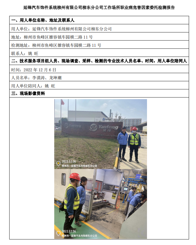 延鋒汽車飾件系統(tǒng)柳州有限公司柳東分公司工作場(chǎng)所職業(yè)病危害因素委托檢測(cè)報(bào)告