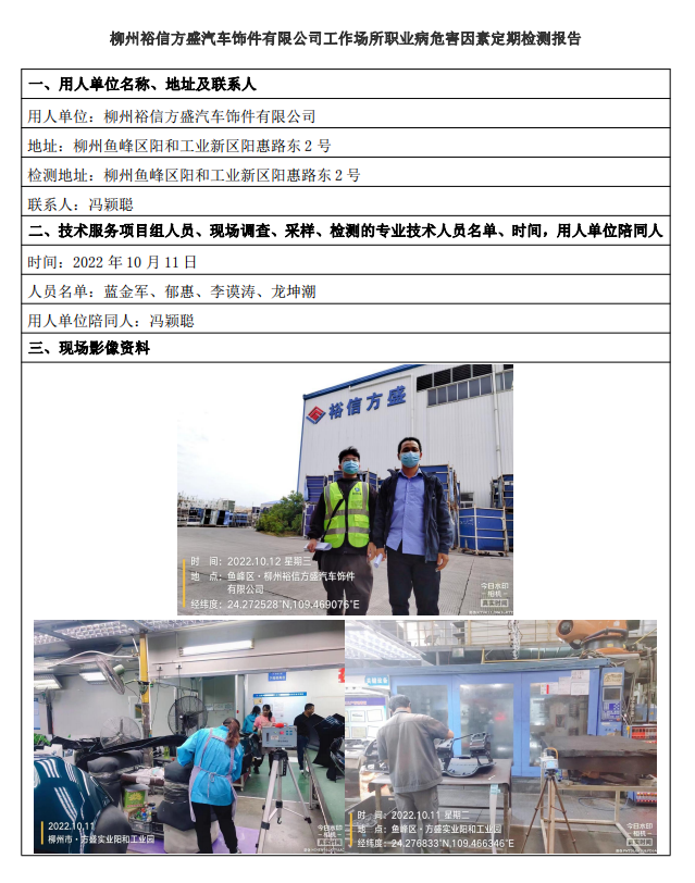 柳州裕信方盛汽車飾件有限公司工作場所職業(yè)病危害因素定期檢測報告