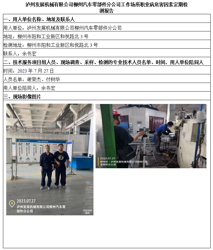 瀘州發(fā)展機(jī)械有限公司柳州汽車零部件分公司工作場所職業(yè)病危害因素定期檢測報(bào)告