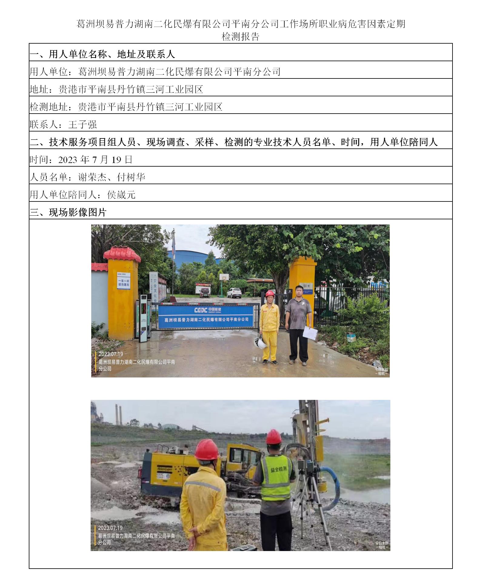 葛洲壩易普力湖南二化民爆有限公司平南分公司工作場所職業(yè)病危害因素定期檢測報告