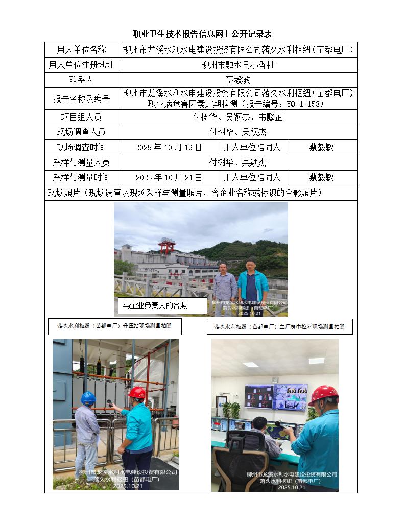 柳州市龍溪水利水電建設(shè)投資有限公司落久水利樞紐(苗都電廠) 職業(yè)病危害因素定期檢測(cè)(報(bào)告編號(hào):YQ-1-153)