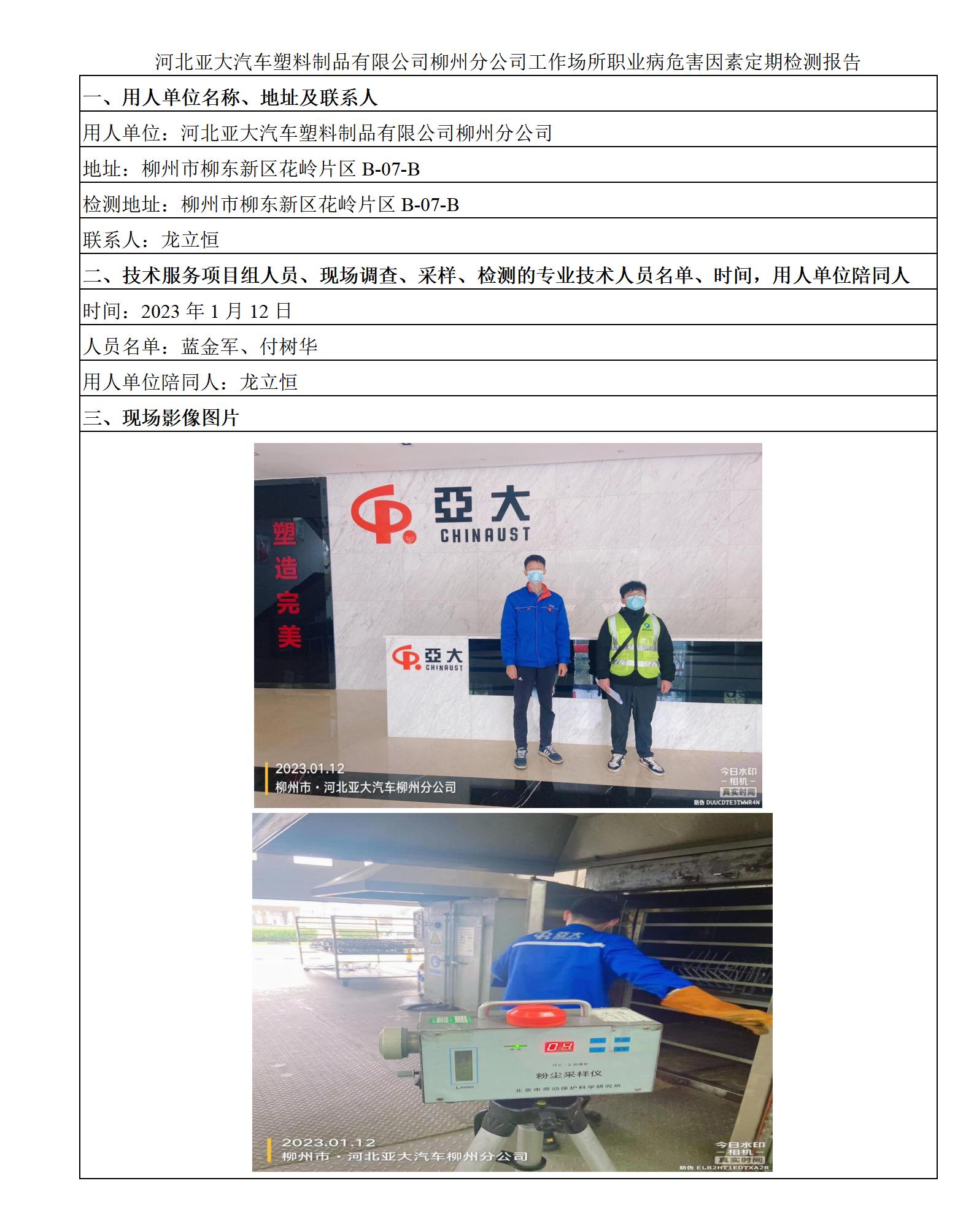 河北亞大汽車塑料制品有限公司柳州分公司工作場(chǎng)所職業(yè)病危害因素定期檢測(cè)報(bào)告