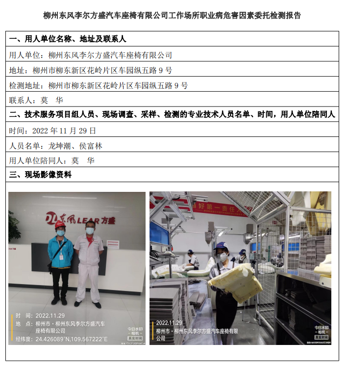 柳州東風(fēng)李爾方盛汽車座椅有限公司工作場(chǎng)所職業(yè)病危害因素委托檢測(cè)報(bào)告