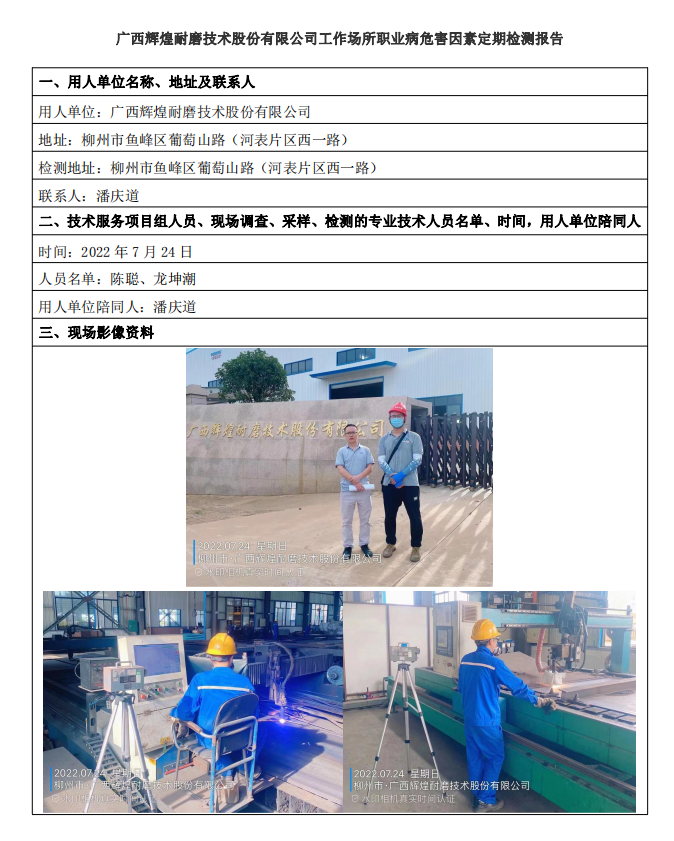 廣西輝煌耐磨技術(shù)股份有限公司工作場所職業(yè)病危害因素定期檢測報(bào)告