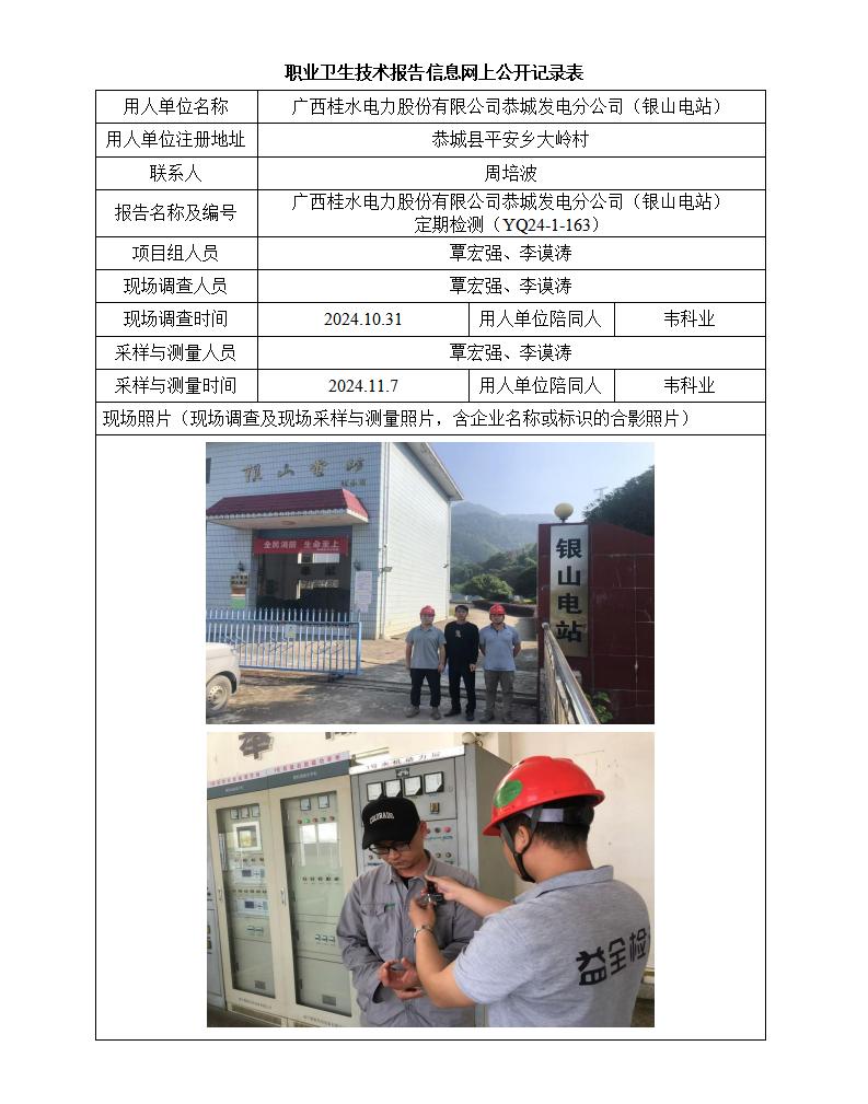 廣西桂水電力股份有限公司恭城發(fā)電分公司(銀山電站)工作場所職業(yè)病危害因素定期檢測報告