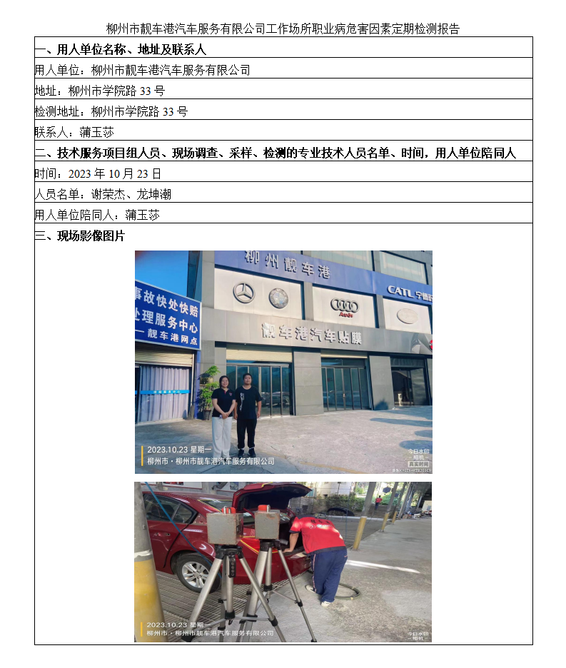 柳州市靚車港汽車服務(wù)有限公司工作場(chǎng)所職業(yè)病危害因素定期檢測(cè)報(bào)告