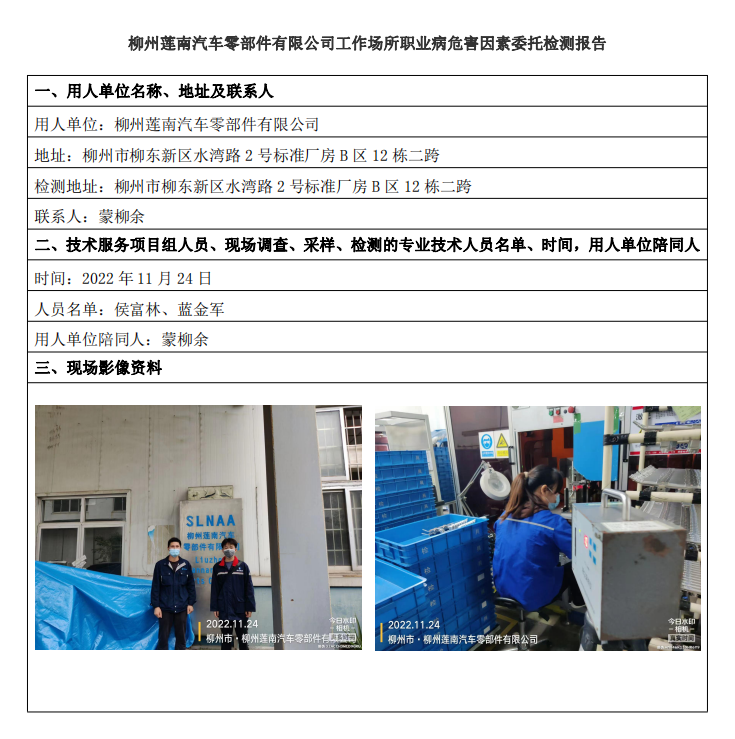 柳州蓮南汽車零部件有限公司工作場所職業(yè)病危害因素委托檢測報告