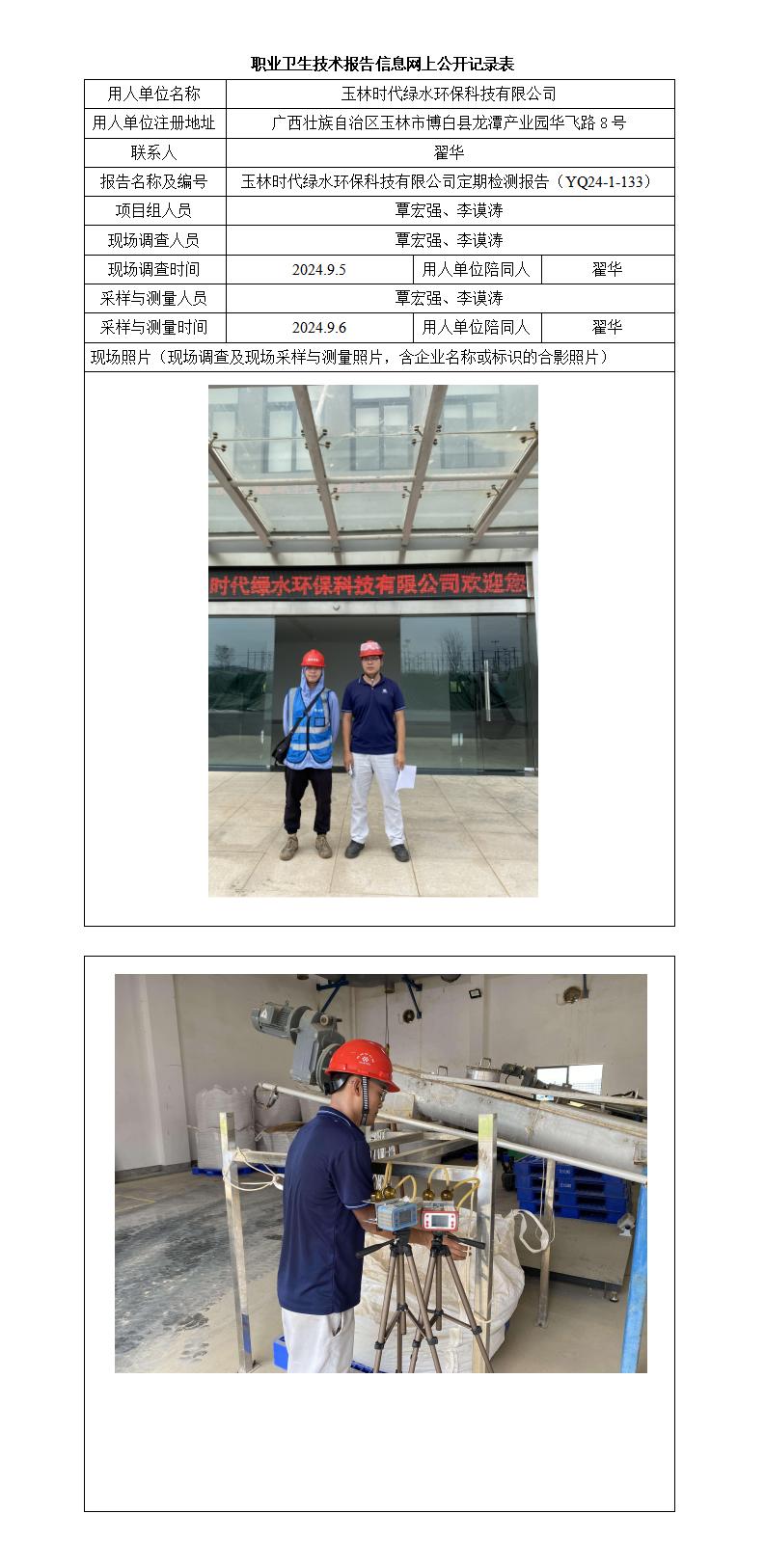 玉林時(shí)代綠水環(huán)?萍加邢薰竟ぷ鲌(chǎng)所職業(yè)病危害因素定期檢測(cè)報(bào)告