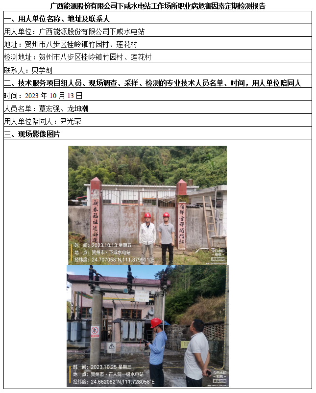 廣西能源股份有限公司下咸水電站工作場所職業(yè)病危害因素定期檢測報告