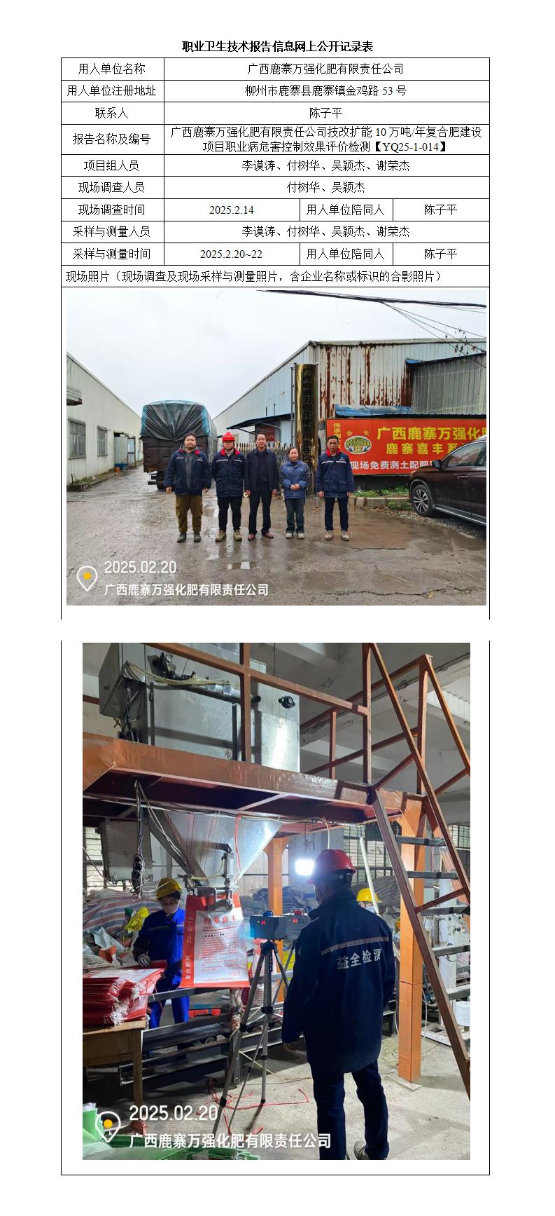 廣西鹿寨萬強(qiáng)化肥有限責(zé)任公司技改擴(kuò)能10萬噸/年復(fù)合肥建設(shè)項(xiàng)目職業(yè)病危害控制效果評(píng)價(jià)檢測報(bào)告