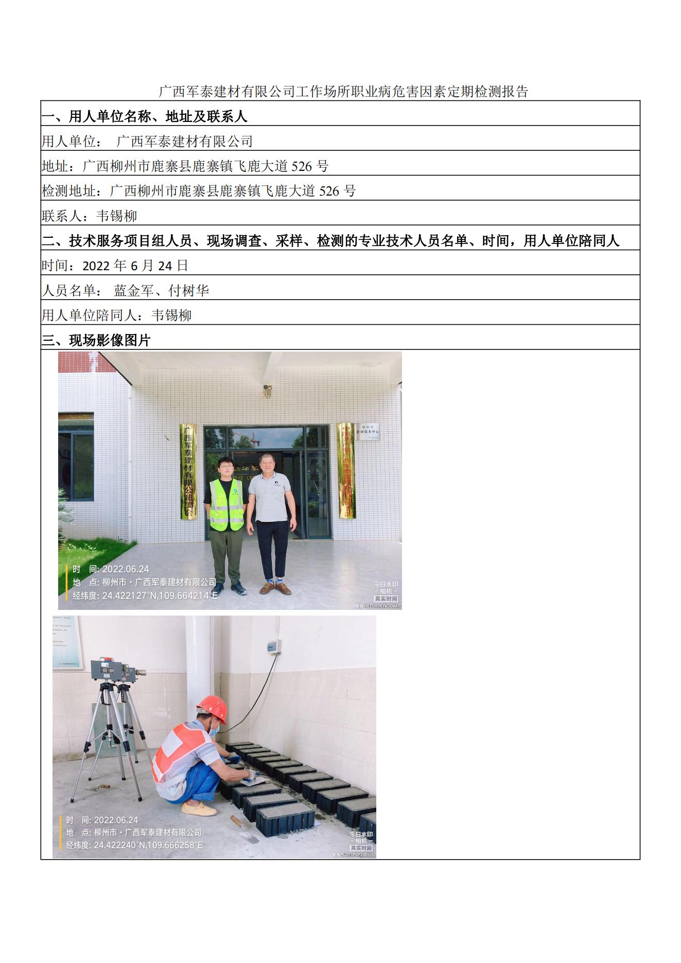 廣西軍泰建材有限公司工作場所職業(yè)病危害因素定期檢測報告