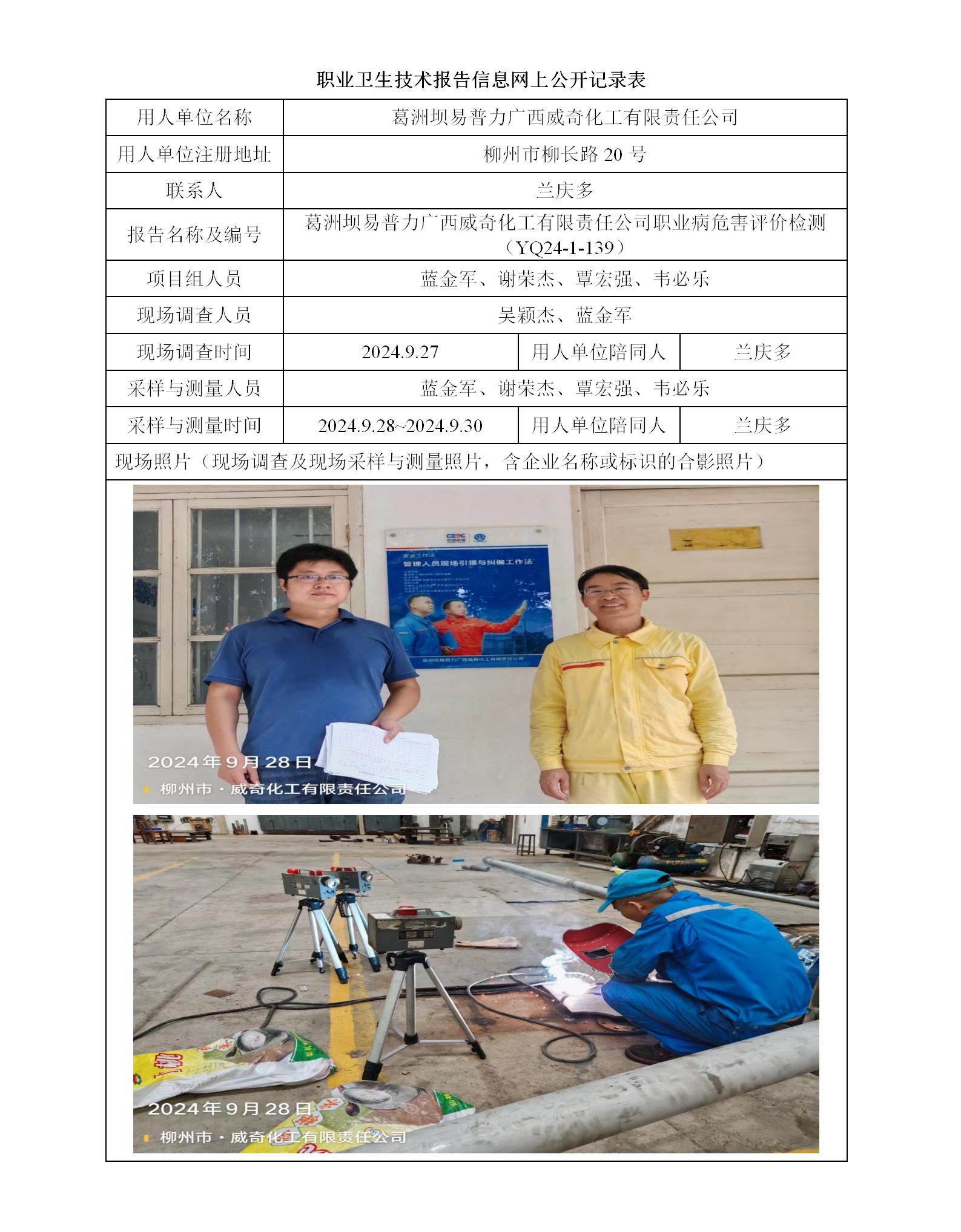 葛洲壩易普力廣西威奇化工有限責(zé)任公司工作場所職業(yè)病危害因素評價檢測報告