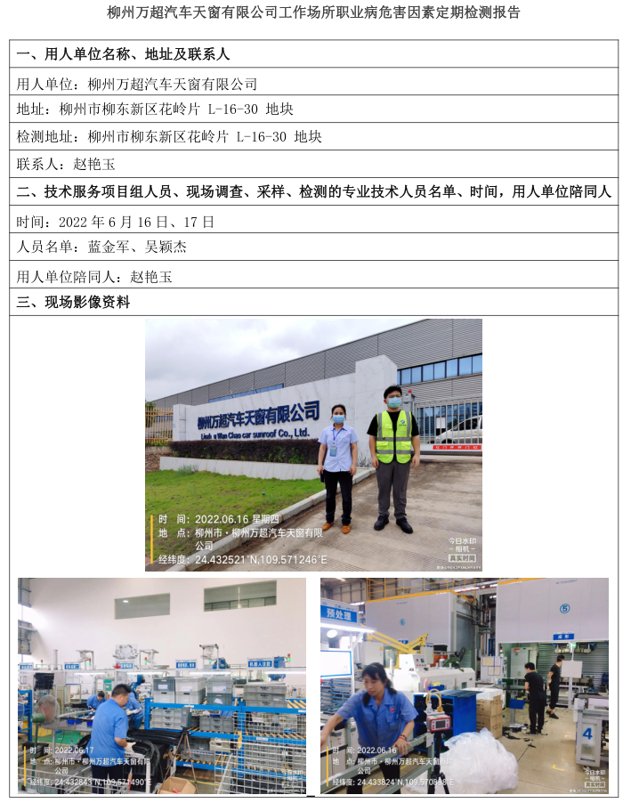 柳州萬(wàn)超汽車(chē)天窗有限公司工作場(chǎng)所職業(yè)病危害因素定期檢測(cè)報(bào)告